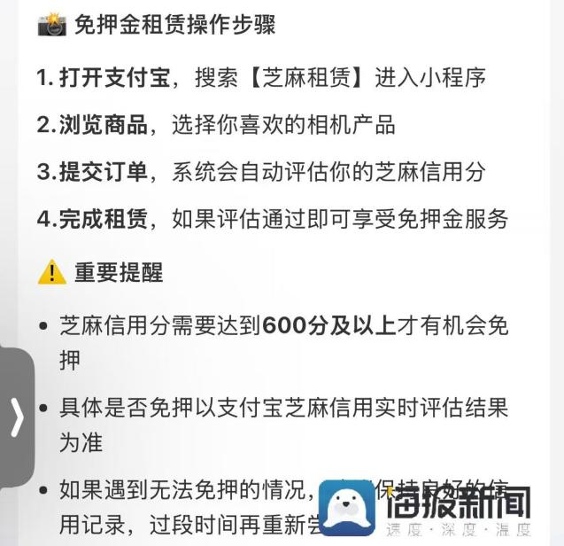 记者从多家线上相机租赁平台了解到,当前市场需求持续攀升,90后、00后成为消费主力。信用免押是推动线上相机租赁普及的关键。目前多数线上租赁订单可通过芝麻信用等第三方信用体系实现免押。芝麻租赁显示,一般来说,芝麻信用≥600分即可享受免押金服务。
