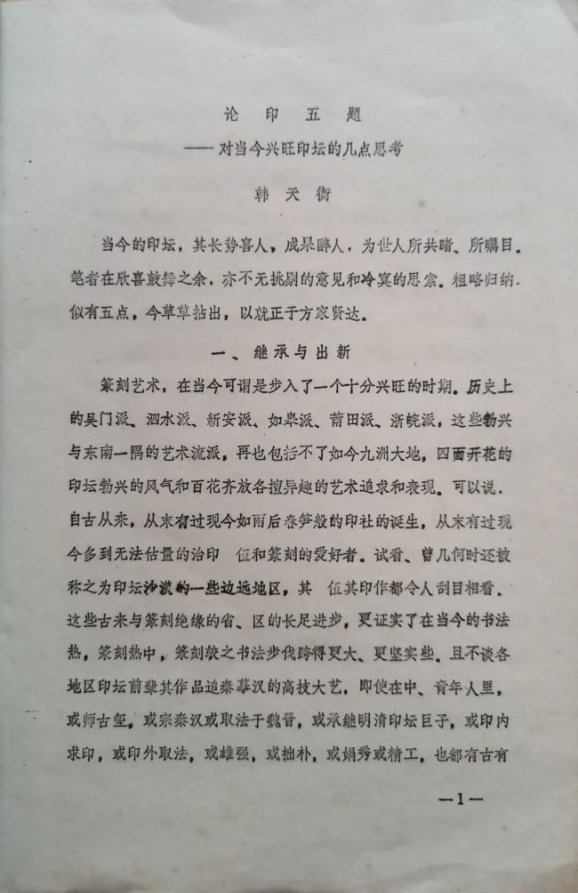 强烈的历史意识与批判性继承。韩老师具有宏阔的篆刻史视野,他对战国秦汉以来的篆刻艺术史,特别是明清流派印直至近现代诸家都有精深的研究和独到的见解。他不仅熟练掌握了秦汉印的创作技法,更理解明清各家各派产生的历史背景、艺术主张和局限得失。韩老师清醒地认识到自己所处的历史坐标和时代优势,既有对传统的敬畏,又有开创篆刻艺术新局面的使命感。他提出了“传统万岁,创新是万岁加一岁”的著名艺术论断,是基于对篆刻历史的深刻理解和批判性继承,才赋予了他篆刻创新的底气和力量。早在1988年8月,韩老师在西泠印社建社85周年大会学术交流会上,发表了《论印五题—对当今兴旺印坛的几点思考》一文,就对篆刻艺术的继承与出新有了比较明确的论述,他说:“辩证法告我们:历劫不磨的优秀传统是往日之新,今日公认的新面,势必成为明日的传统。轻率粗暴地蔑视传统,正是出其意料地把想往的创新也纳入蔑视、砸烂的范围。”韩老师对篆刻艺术历史和现状的清醒认识,是基于正确的历史发展观,并一直遵循着这个观点。韩老师的篆刻艺术,是在对中国篆刻史深入了解、烂熟于心基础上的创新与发展,他的艺术语言和线条构成,如果99%是传统的影响,而1%就是韩老师的可贵创新。而那些稍有继承,就大谈创新的艺术家,相对于韩老师的深厚学养,往往就相形见拙。