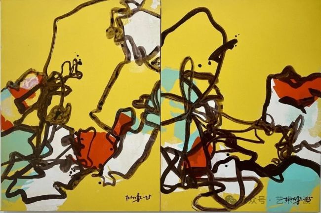 林海勇的《山水》从中国书法中汲取灵感,线条的提按、转折、疾徐,与色彩互动,抽象为一种纯粹的视觉节奏和情绪波动,画面充盈着一种东方写意。