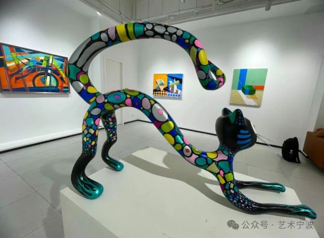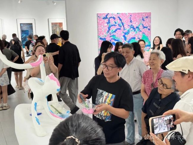 邵永红的作品《爆眼波普灵犬》《糖果喵》等传递出的生命的温度与灵动,也蕴含着童真与戏剧性的张力。“视觉玩家”邵永红给自己的定位是:做好玩的艺术,好好玩艺术,希望像孩子一样去玩艺术。在开幕式现场,观众可以自由参与“小猫萌宠”的“创作”,更是把艺术的治愈能量直接传递,也让审美趣味融入日常生活。