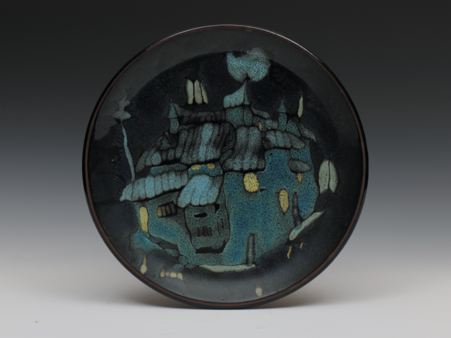 ▲陈烈汉颜色釉《高温釉画“水乡夜景”盘》1987年福建漳州