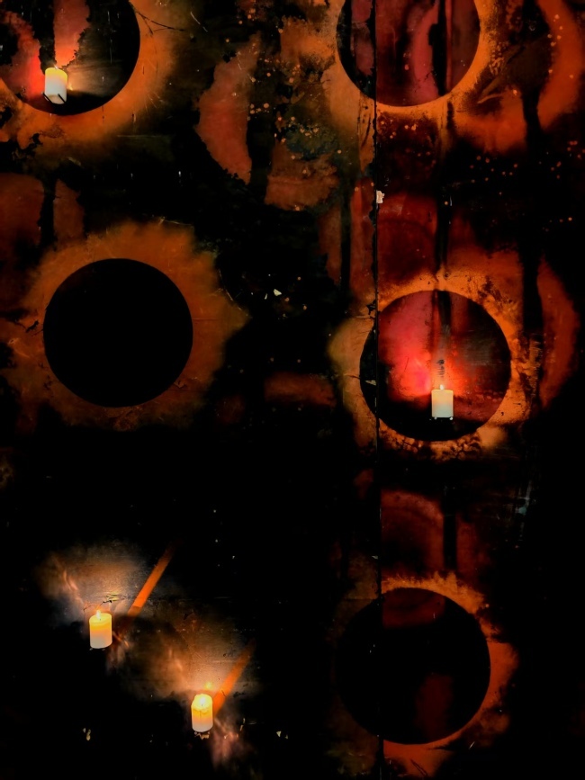 《原野 》 丙烯、油彩、木板、蜡烛、铁 244×244×16cm 2023-2025