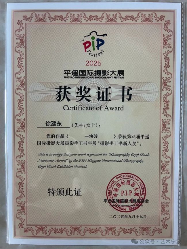 当徐建东的当代摄影个展《一块砖》在2025宁波国际摄影季引发强烈反响,并荣获“当代摄影最佳荣誉奖”后,又从PIP2025平遥国际摄影大展现场传来好消息,手工书《一块砖》荣获摄影手工书单元的大奖:“摄影手工书新人奖”。