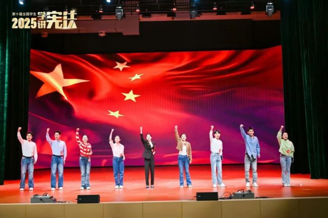情景剧《铸魂》由臧笑楠导演,学生李昊编剧,刘昊、王辛格、陈一慧等2024级表演班学生主创,以双线叙事交织展开,聚焦1949年新中国诞生前夕两大历史性创作:田汉在战火中奋笔疾书,以血肉文字铸就《义勇军进行曲》的呐喊;曾联松于斗室伏案设计,以五星拱辰构思出国旗的庄严。他们的激情与挣扎,终凝成国家象征的灵魂。1954年9月20日第一届全国人民代表大会第一次会议通过的《中华人民共和国宪法》将国旗写入宪法;时光流转,2004年3月14日第十届全国人民代表大会第二次会议通过的《中华人民共和国宪法修正案》将国歌正式写入根本大法。剧本通过跨越时空的对话与集体宣言,展现从艺术创作到法治奠基的历程,揭示了旗帜与歌声背后——是人民的意志,以及《中华人民共和国宪法》为民族精神铸就的永恒基石。