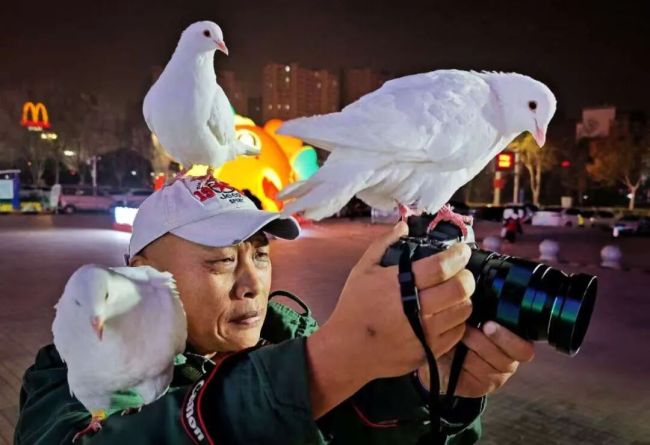2025年1月3日,菏泽市和谐广场。摄影家杨明在拍照片,三只鸽子分别飞到他的身上,好像在欣赏他拍的照片。