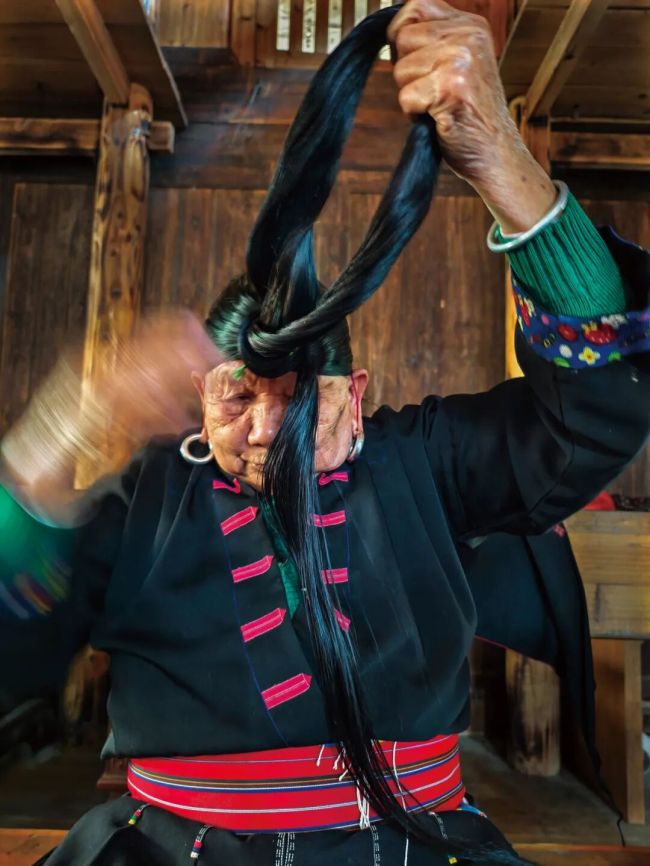 2025年3月21日,广西龙胜各族自治县龙脊镇黄洛红瑶长发村。90岁潘桂英正在梳理自己2.1米长的辫子。目前,她是寨子里年龄最大、辫子最长的老阿婆,每天还要参加两场给游客表演的长发歌舞。