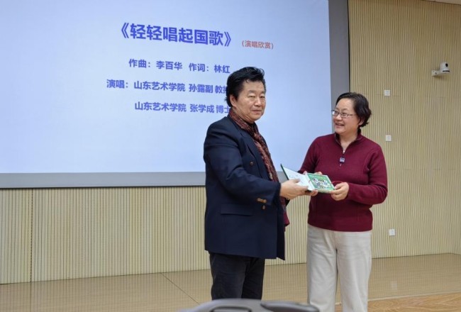 山东艺术学院副教授孙露,青年教师张学成,山东师范大学音乐学院教师丁兰,现场演唱了李百华教授的原创作品《再唱沂蒙山》《轻轻唱起国歌》《长河入海》《中华梦圆》等歌曲,生动展现音乐不仅是旋律的艺术,更是歌声里的中国文化的载体、时代的回响。