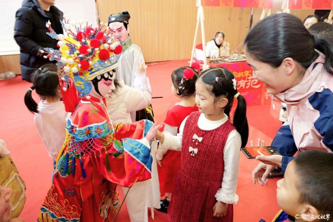 “以前只在电视上见过,没想到今天能近距离看皮影戏!”社区居民王女士牵着孙子的手,守在皮影戏幕布前目不转睛。上午10点,传承人吴云凤团队带来的《东郭先生》《小神仙》等经典剧目准时开演。五彩皮影在灯光下灵动起舞,婉转的唱腔与清脆的锣鼓声交织在一起,引得孩子们时而屏息凝神,时而拍手欢呼。演出落幕,小观众们争先恐后围向后台,触摸精致的皮影道具,在传承人指导下尝试操纵技巧,亲身感受“光影魔法”的魅力。下午2点,有着两千余年历史的莱西木偶戏一登场,便将现场气氛推向顶点。《梁祝》的唯美舞姿、《木偶变脸》的瞬间切换、《天女散花》的彩绸翻飞,人偶同台的创新演绎让观众直呼“过瘾”。“特意从崂山区开车30多公里赶来,孩子全程眼睛都亮着!”纪女士笑着说,自家孩子是木偶戏的“小粉丝”,这次现场观演让孩子真切感受到了传统文化的魅力。演出结束后,观众们纷纷与木偶道具合影留念,向传承人请教表演秘诀,热闹的氛围久久不散。