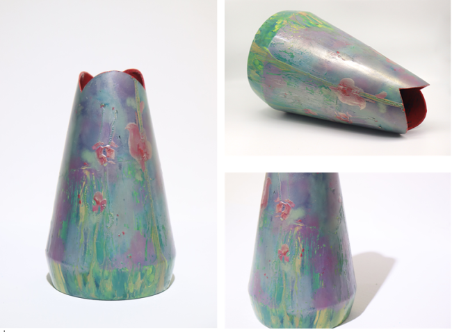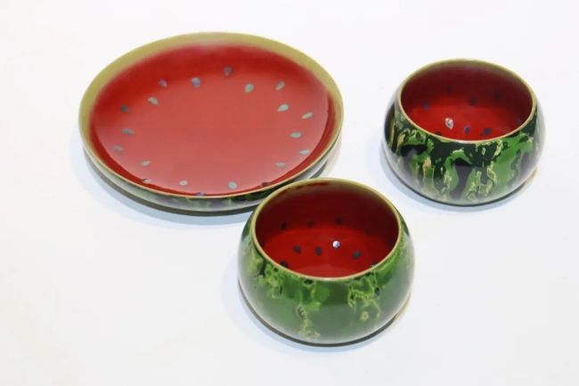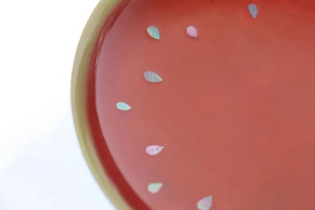 作品以夏日西瓜为灵感原点,将传统大漆中的螺钿镶嵌与变涂工艺转译为鲜活的视觉语言。以具象造型承载传统技艺,让温润漆质与瓜果意趣自然相融,赋予器物童真气息与生命质感。作品既保留器皿的实用功能,又在工艺与形态之间达成平衡,实现传统漆艺在当代生活中的诗意转译与新生表达。