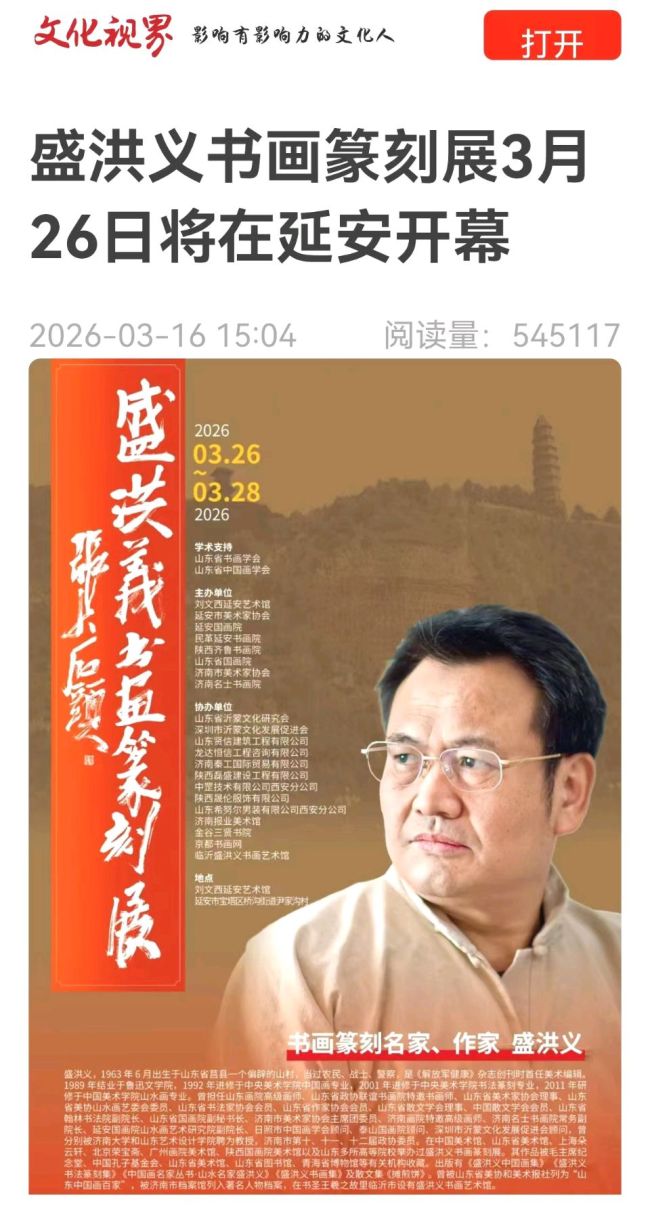 3月26日上午,由山东省书画学会、山东省中国画学会提供学术支持,刘文西延安艺术馆、延安市美术家协会、延安国画院、延安民革画院、陕西齐鲁书画院、山东省国画院、山东沂蒙画派研究院、济南市美术家协会、济南名士书画院等单位联合主办的“盛洪义书画篆刻展”在刘文西延安艺术馆隆重开幕!