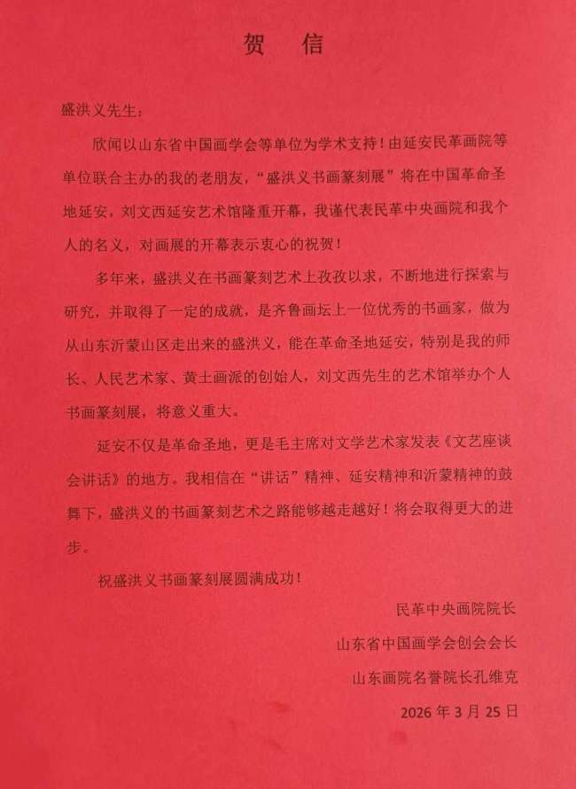 欣闻以山东省中国画学会等单位为学术支持,由延安民革画院等单位联合主办的“盛洪义书画篆刻展”将在中国革命圣地延安刘文西延安艺术馆隆重开幕,我谨代表民革中央画院和我个人,对画展的开幕表示衷心的祝贺!