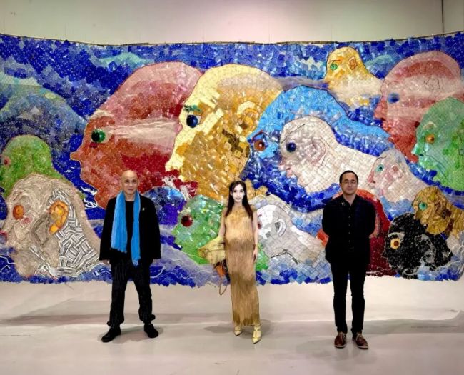 方力钧(左)、刘木维(中)、杜曦云(右)在作品《2025-2026》前