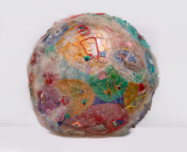 在海边捡拾废弃渔网、浮漂、钓钩、手套、玩具、食品包装等“垃圾”并转化出的创作,是方力钧艺术生涯中的又一次跃迁。捡拾各种海洋垃圾,然后分类、清洗、切割、热熔、组合、缠绕、拼装,打破了艺术创作和日常生活、创作与回收的边界,让即兴与控制、偶然与秩序共生。他悬置这些“垃圾”的实用属性与环保说教,将它们视为纯粹的造型元素,保留原始色彩、破损肌理与海浪冲刷痕迹,让材料自身直观诉说消费社会的属性与文明的代价。